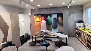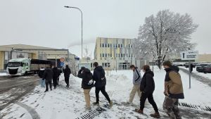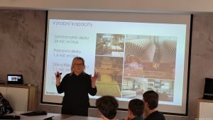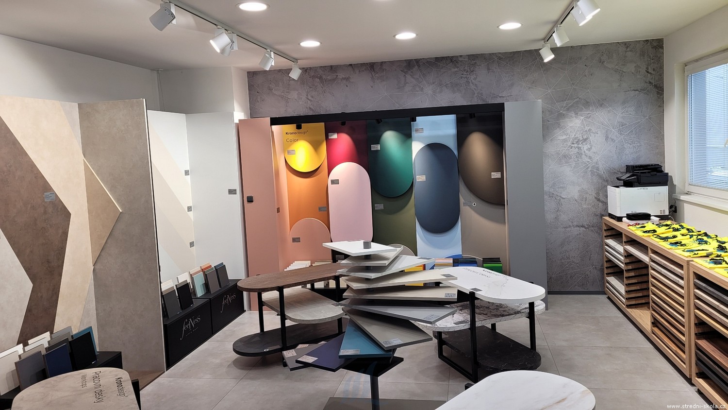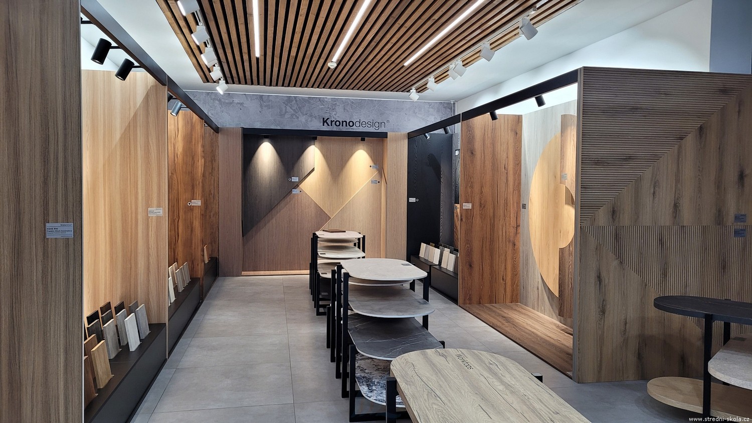 Zástupci firmy nás provedli výrobou dřevotřískových desek, OSB desek používaných ve stavebnictví, kuchyňských pracovních desek upravených fólií postformingem i procesem laminace plošných třískových desek. V rámci přednášky nám představila paní Pospíšilová nejen portfolio produktů firmy a aktuální novinky, ale i filozofii firmy v oblasti udržitelné výroby a odpovědnosti k životnímu prostředí. Ve výrobě nebylo umožněno fotografovat a snímky jsou tedy jen ze showroomu.