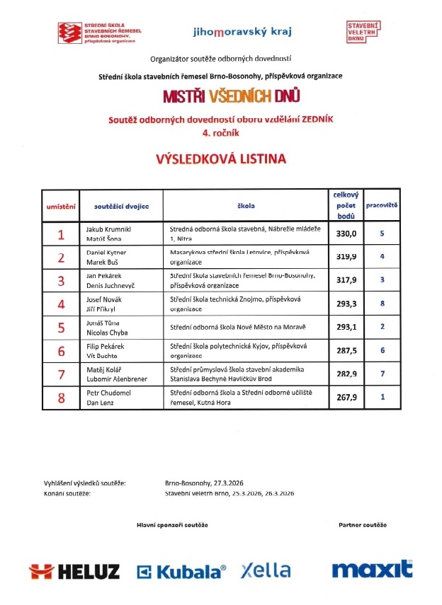 Ve dvou březnových dnech (25. 3. - 26. 3. 2026) se sešli na brněnském výstavišti žáci stavebních oborů středních škol na čtvrtém ročníku oblastní soutěže SOD – Soutěže odborných dovedností s podtitulem „Mistři všedních dnů“. Soutěž byla pořádána SŠ Stavebních řemesel Brno – Bosonohy pod patronací firem, kraje i města. Akce probíhá v rámci Stavebního veletrhu a Masarykovu střední školu Letovice reprezentovali Daniel Kytner a Marek Buš, obor Zedník.