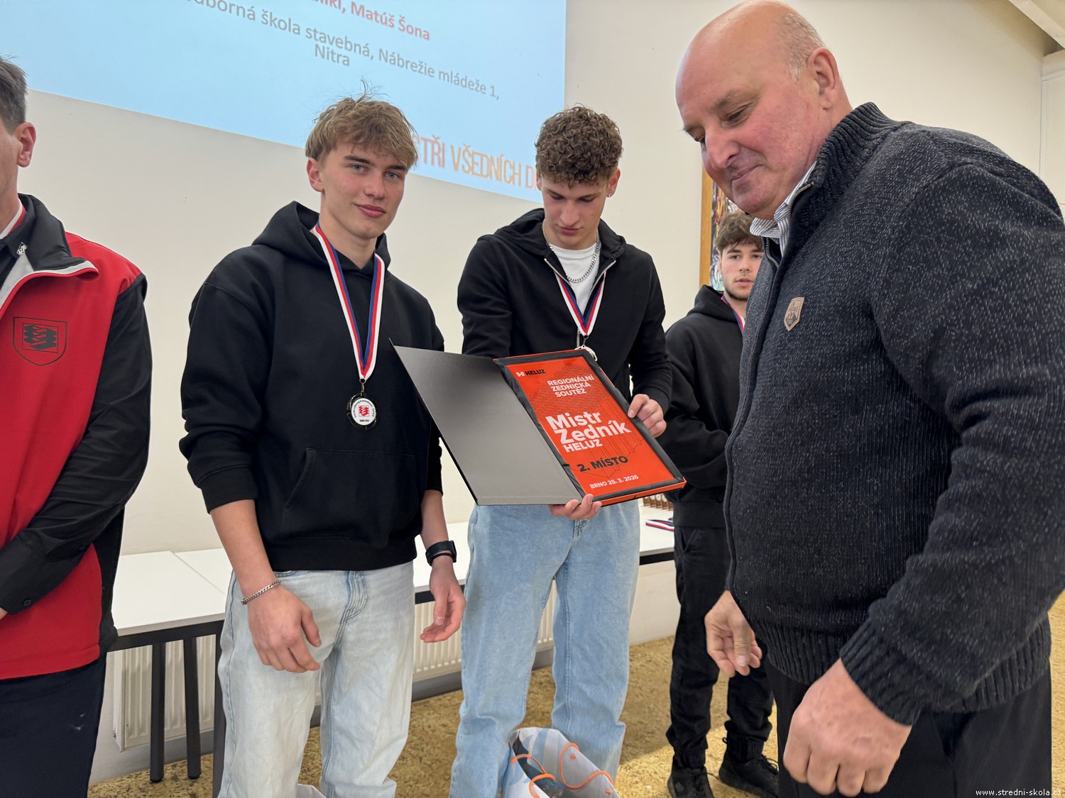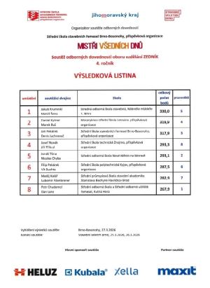 Chlapci prováděli zdění fragmentu podle soutěžního zadání z materiálů od společnosti HELUZ, Xella a zhotovili omítku Maxit. Dvojice reprezentovala příkladně školu a nasbírala cenné zkušenosti. Hochům se podařilo celkově získat krásné první místo mezi českými týmy a druhé místo z celkem osmi zúčastněných škol napříč Českou a Slovenskou republikou. Ve zdění z materiálu firmy Xella byli nejlepší.