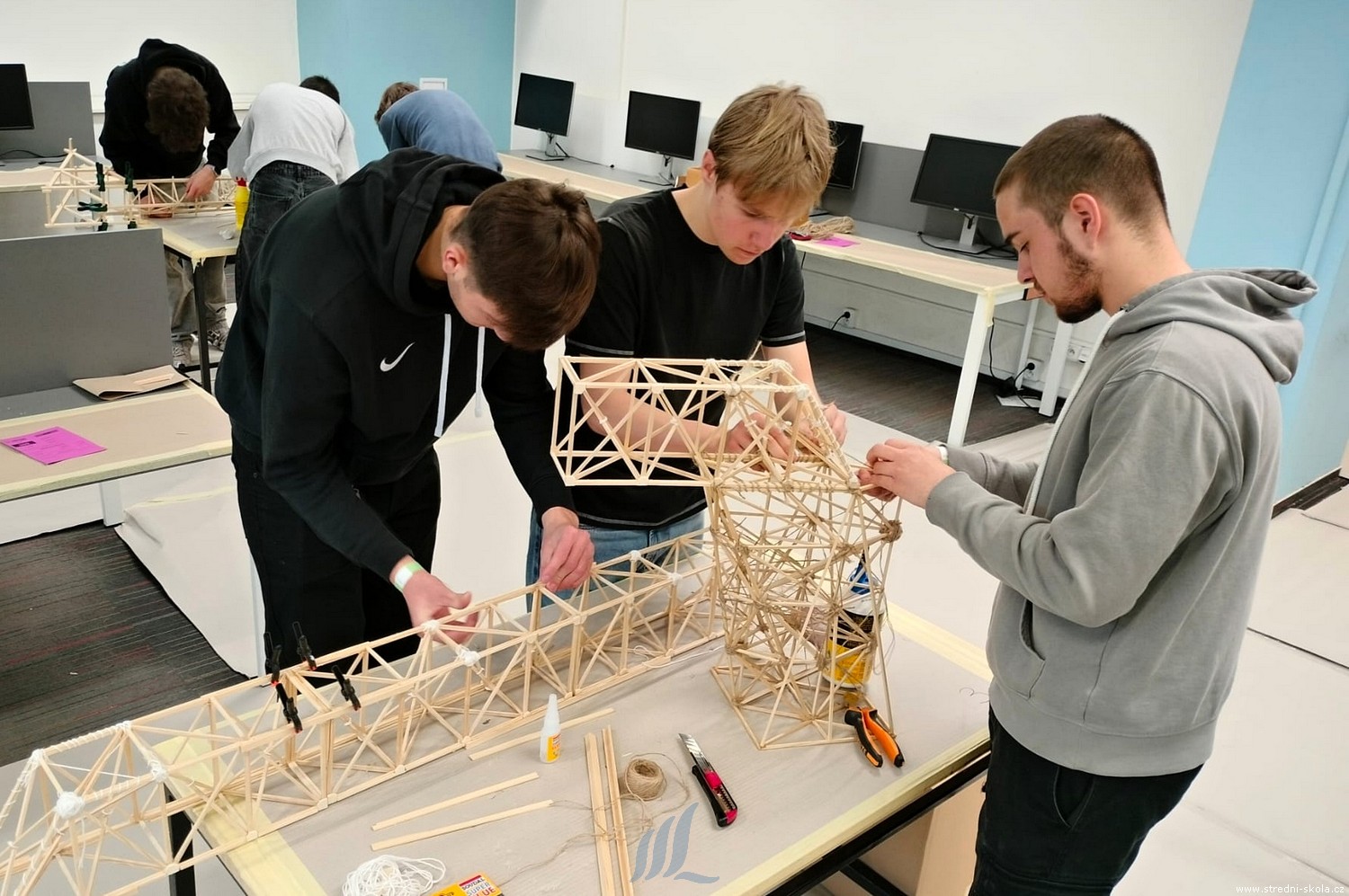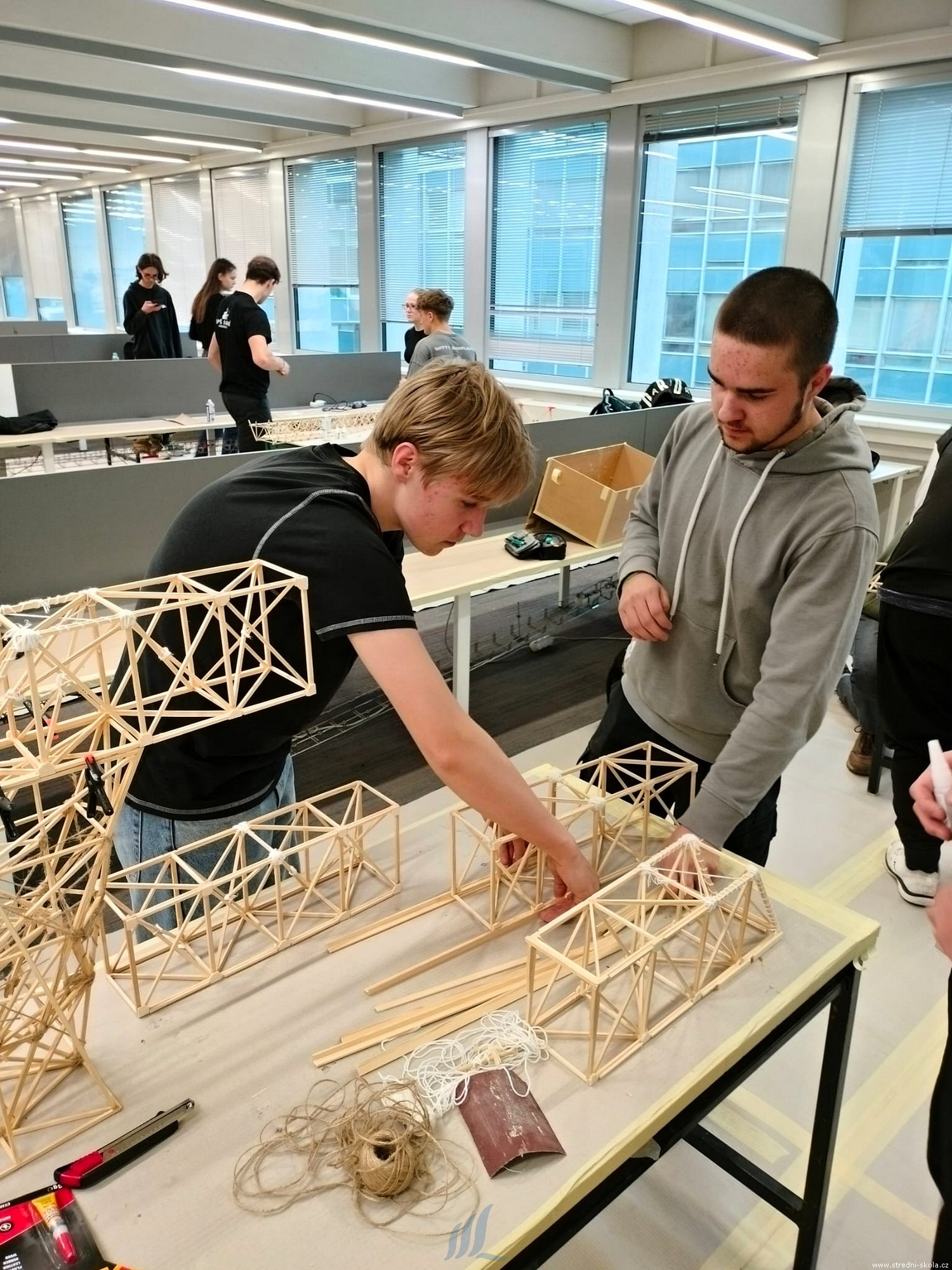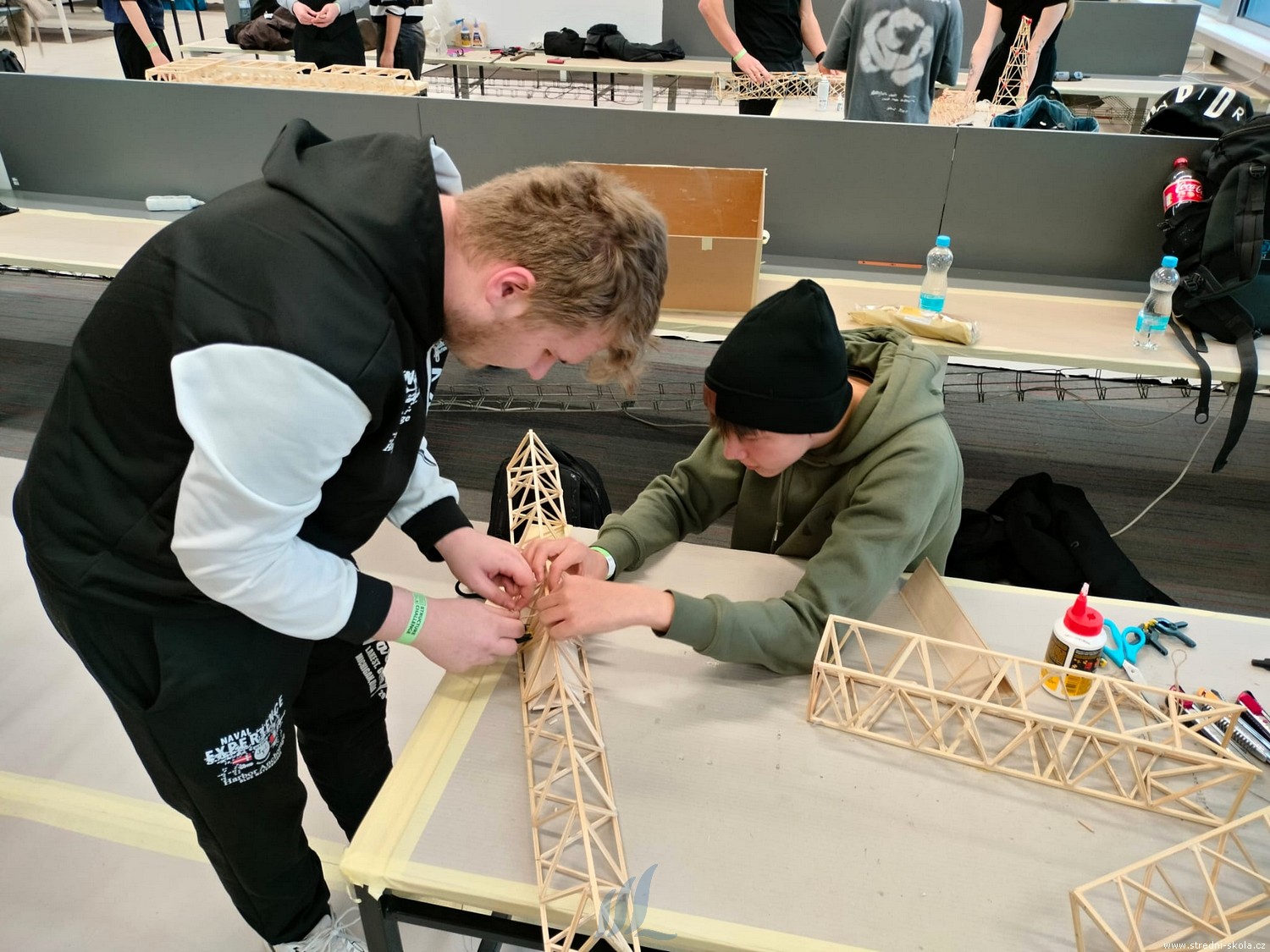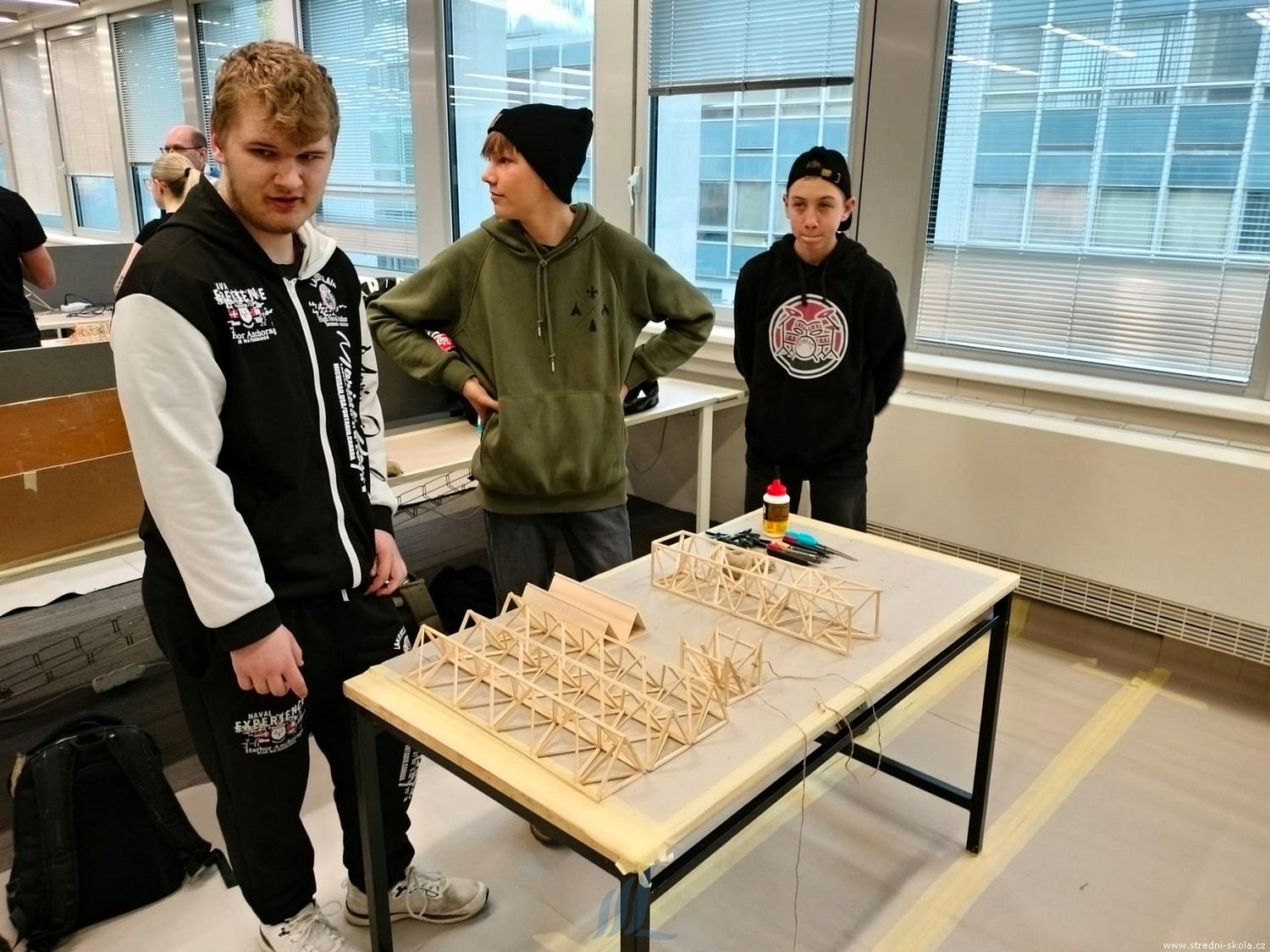 Naši žáci se letos zúčastnili prestižní soutěže Hala roku Junior, která se koná na Fakultě stavební ČVUT v Praze. Soutěž prověřila jejich technické znalosti, trpělivost i týmovou spolupráci – od návrhu konstrukce až po její zatěžovací zkoušku.
