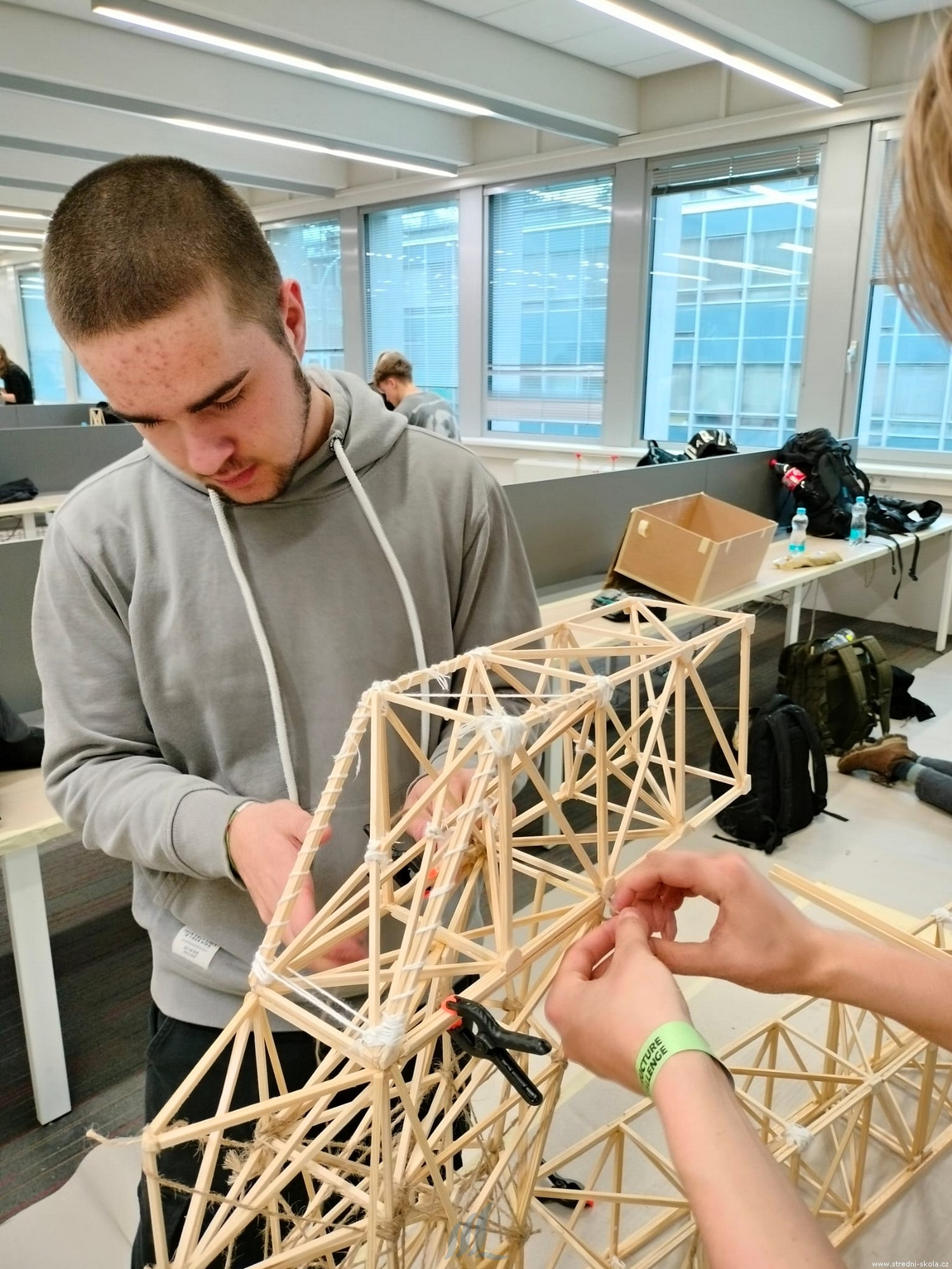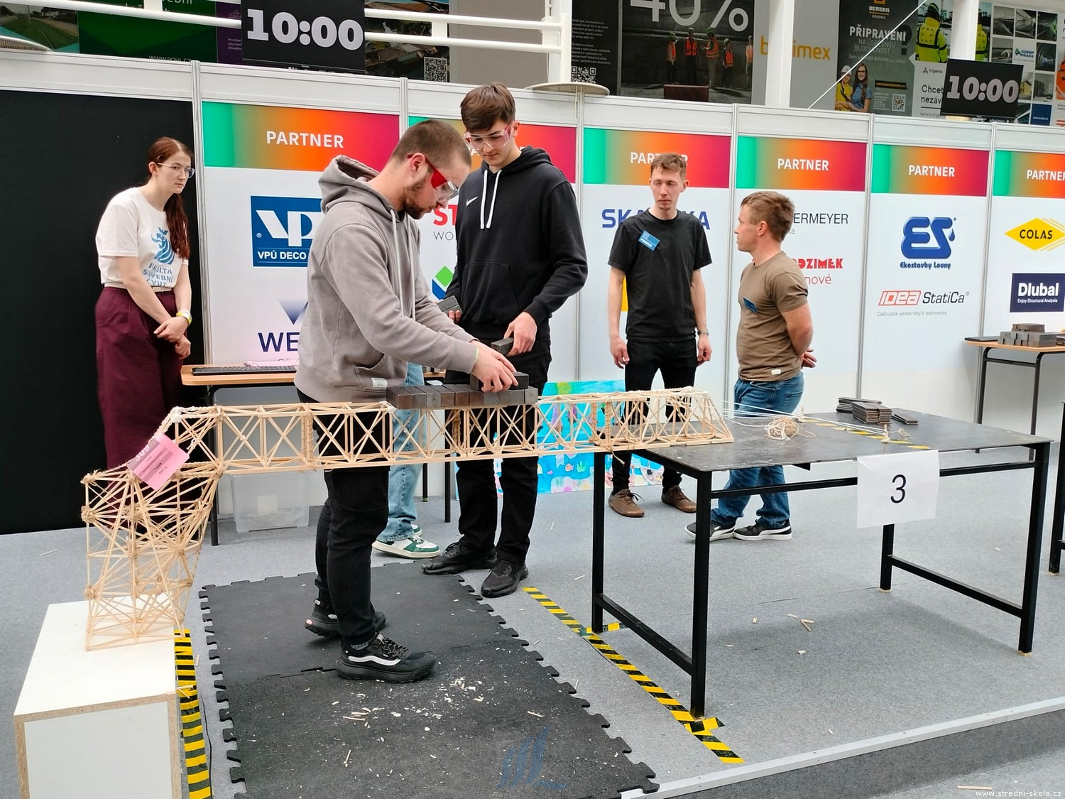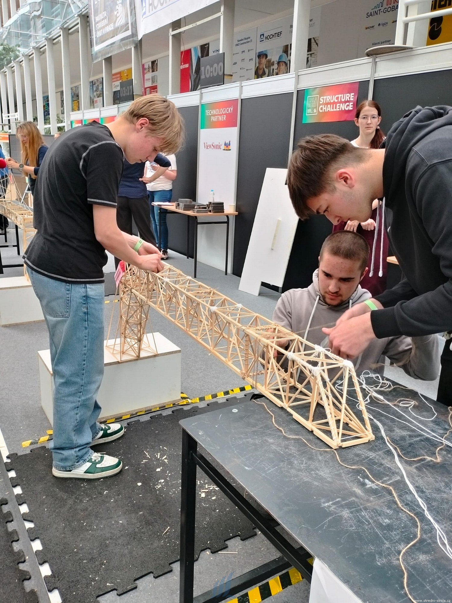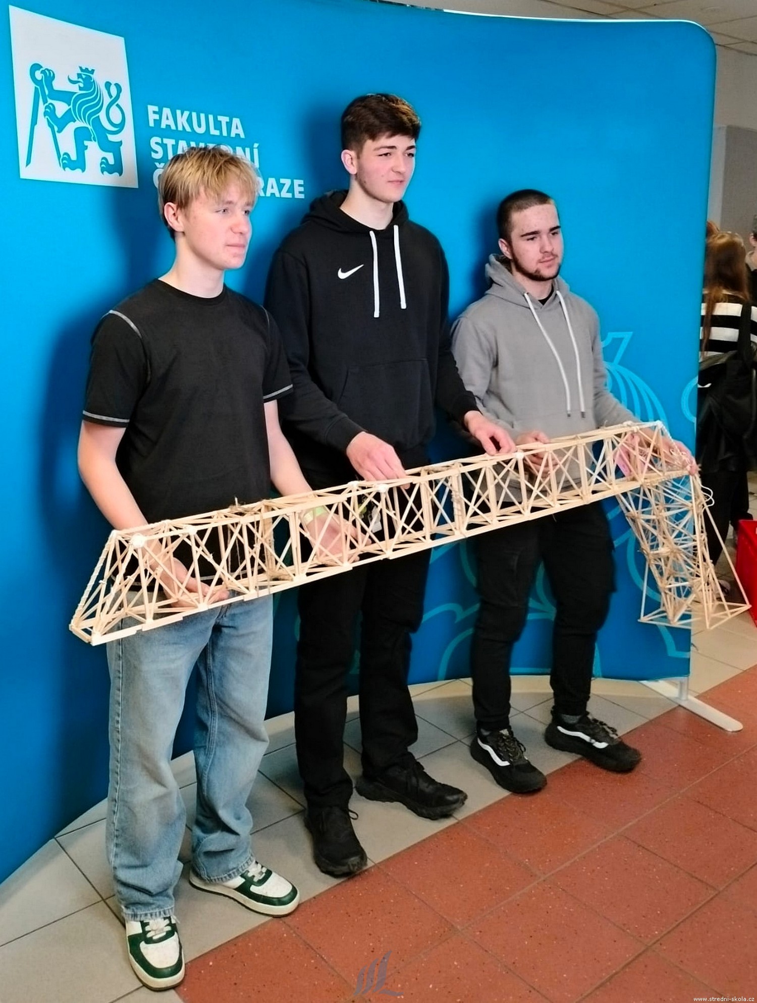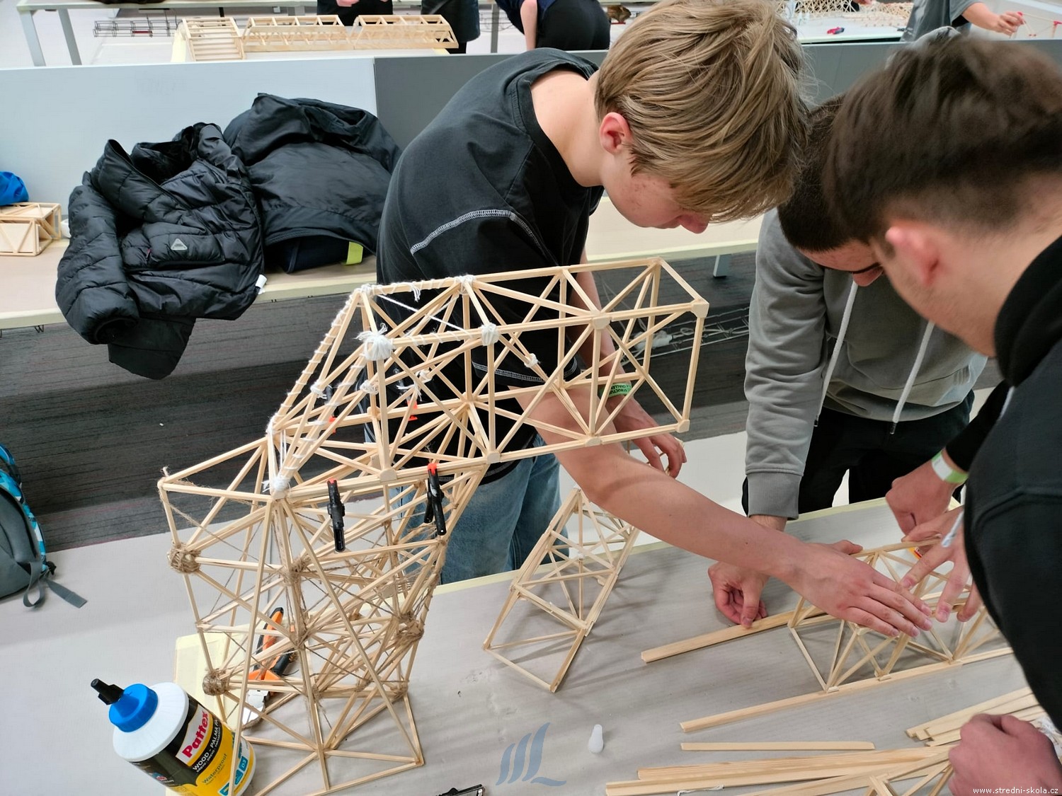 Naši žáci se letos zúčastnili prestižní soutěže Hala roku Junior, která se koná na Fakultě stavební ČVUT v Praze. Soutěž prověřila jejich technické znalosti, trpělivost i týmovou spolupráci – od návrhu konstrukce až po její zatěžovací zkoušku.