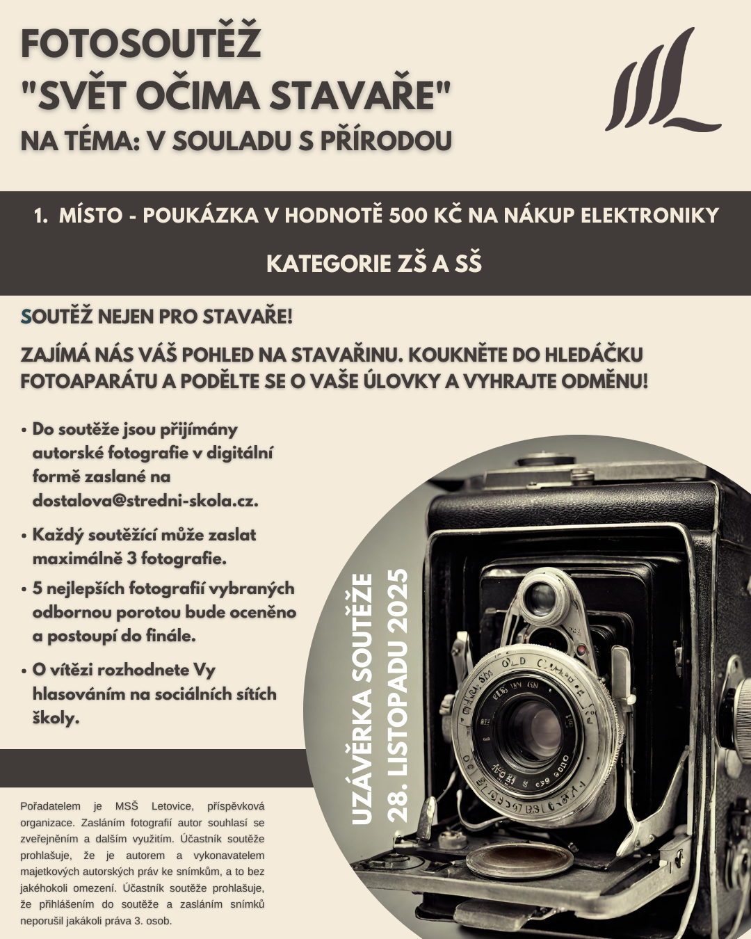 - Do soutěže jsou přijímány autorské fotografie v digitální formě zaslané na dostalova@stredni-skola.cz.