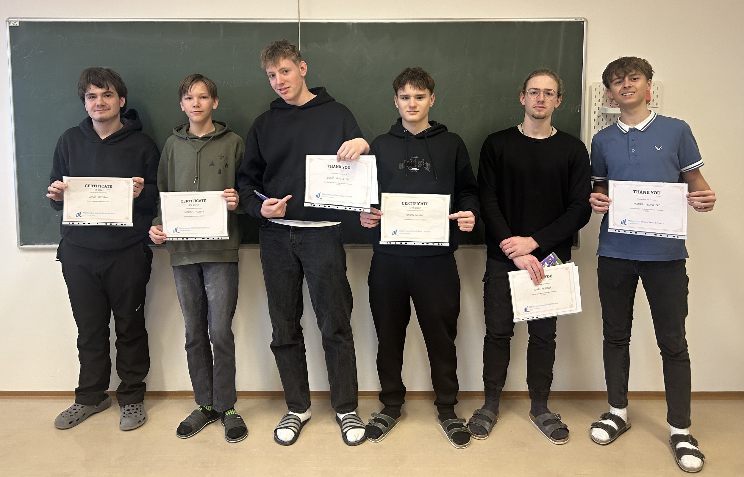 Osm účastníků nejprve absolvovalo písemný test na úrovni B2-C1. Posléze s komisí hovořili o vylosovaném tématu. Jazykové dovednosti studentů byly na velmi pokročilé úrovni a jejich výkony vyrovnané. Rozhodovaly maličkosti. Po vyhodnocení obou částí byli studenti seznámeni s výsledky. Vítěz školního kola postupuje do kola okresního, které se bude konat už 25. února 2026 v Blansku. Držíme pěsti.